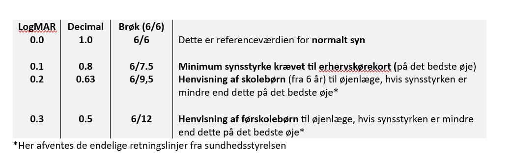 På LogMAR synstavler er 0.0 referenceværdien for et normalt syn. Grænseværdien for henvisning til øjenlæge er 0,2 eller højere. Det vil sige, jo højere logMAR værdi, jo dårligere syn. Nedenfor ses en sammenligning mellem grænseværdier for logMAR og tidligere synstests.